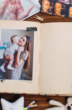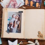 Open album with picture near accessories on wooden background with copy space